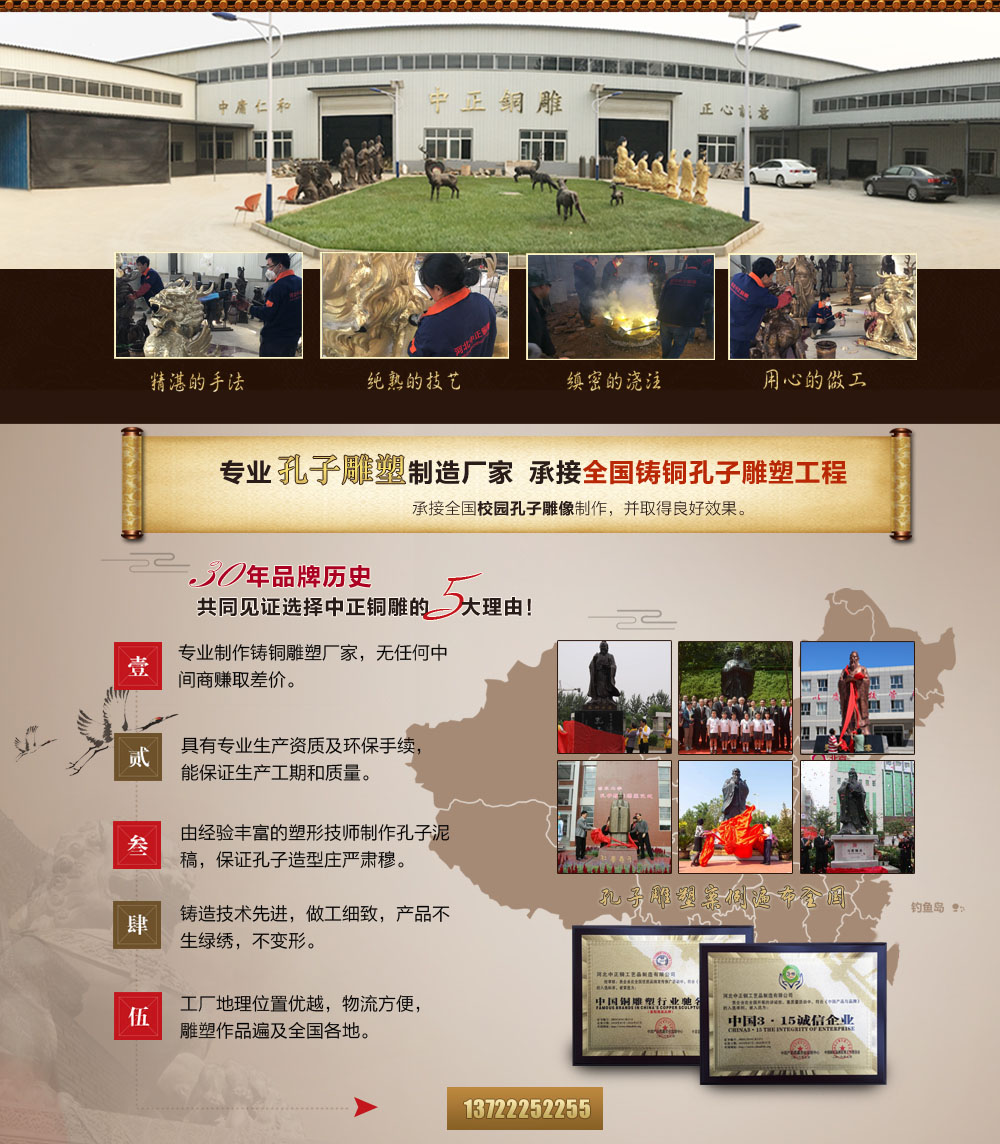 我們廠(chǎng)還具有優(yōu)越的地理位置,離北京、天津都非常近,交通便利,物流方便。我們本著重合同、守信譽(yù)、讓客戶(hù)滿(mǎn)意的經(jīng)營(yíng)理念。竭誠(chéng)為國(guó)內(nèi)外客戶(hù)提供優(yōu)質(zhì)的服務(wù),愿與新老客一起攜手通過(guò)孔子雕塑的制作弘揚(yáng)中國(guó)傳統(tǒng)儒家文化,共創(chuàng)美好未來(lái)。